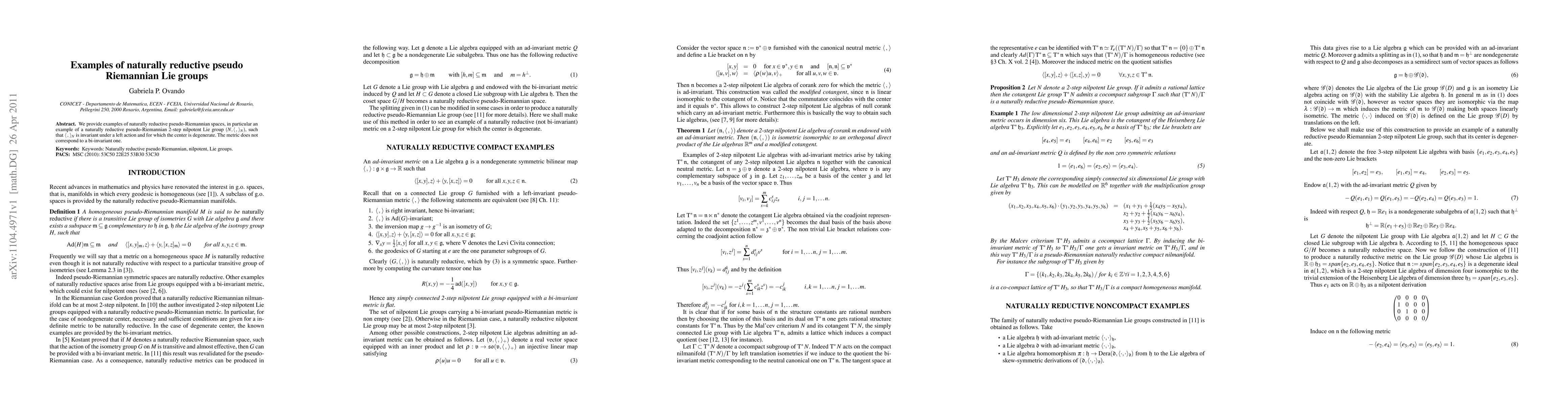 This paper presents examples of naturally reductive pseudo-Riemannian spaces, specifically a 2-step nilpotent Lie group with an invariant metric whose center is degenerate, and which does not support a bi-invariant metric.