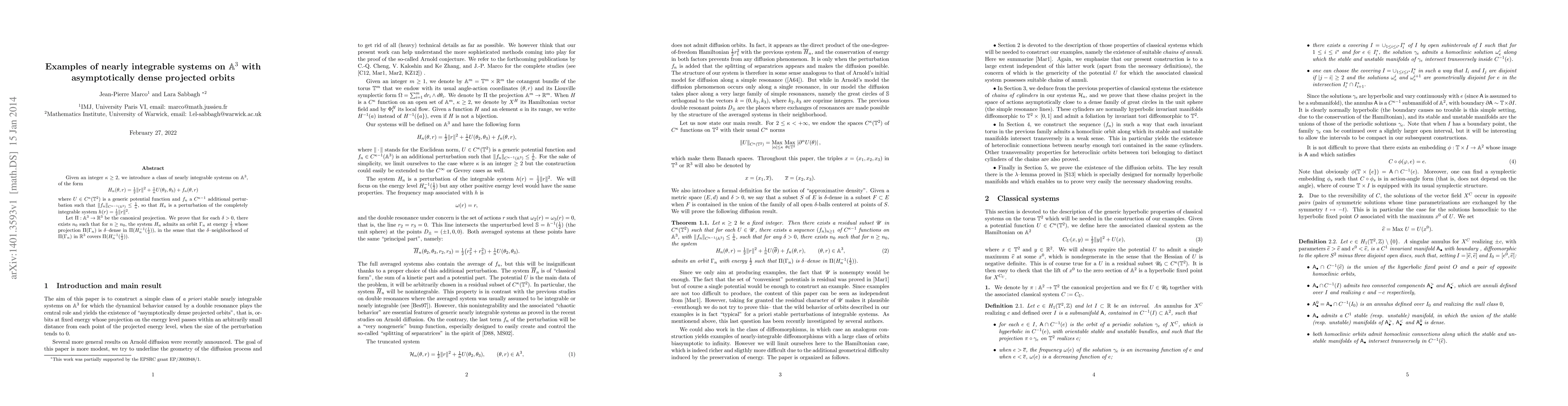 This paper introduces nearly integrable systems on $\mathbb{A}^3$ of the form $H_n(\theta, r)$ and proves that their projected orbits onto $\mathbb{R}^3$ are asymptotically dense for sufficiently large $n$. The systems are perturbations of the integrable system $h(r) = \frac{1}{2} \Vert r \Vert^2$.