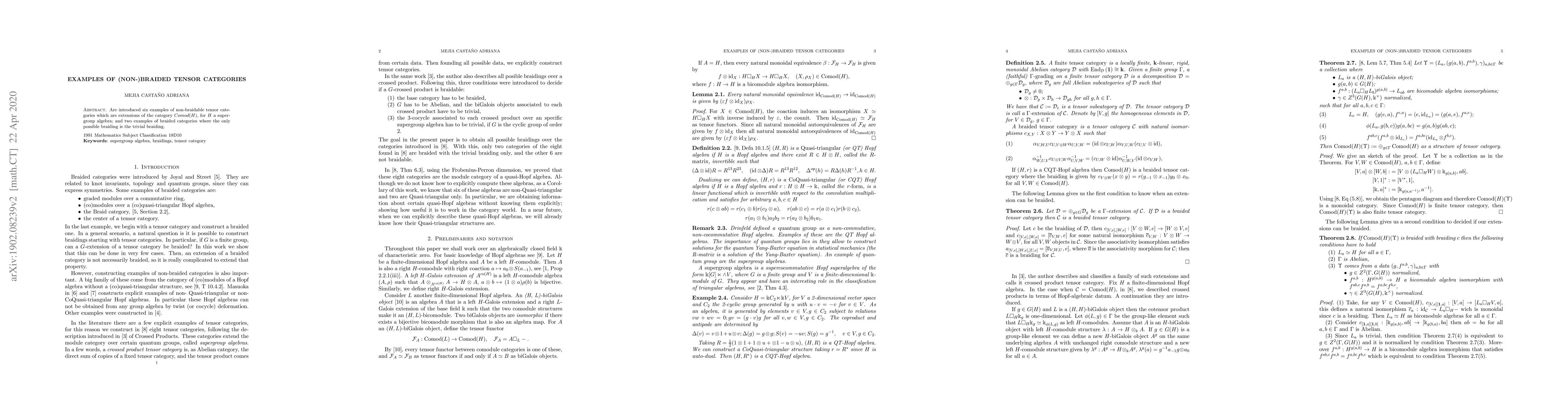 This paper introduces six examples of non-braided tensor categories that extend the category of comodules over a super-group algebra, H, and also presents two examples of braided categories where the only possible braiding is trivial.