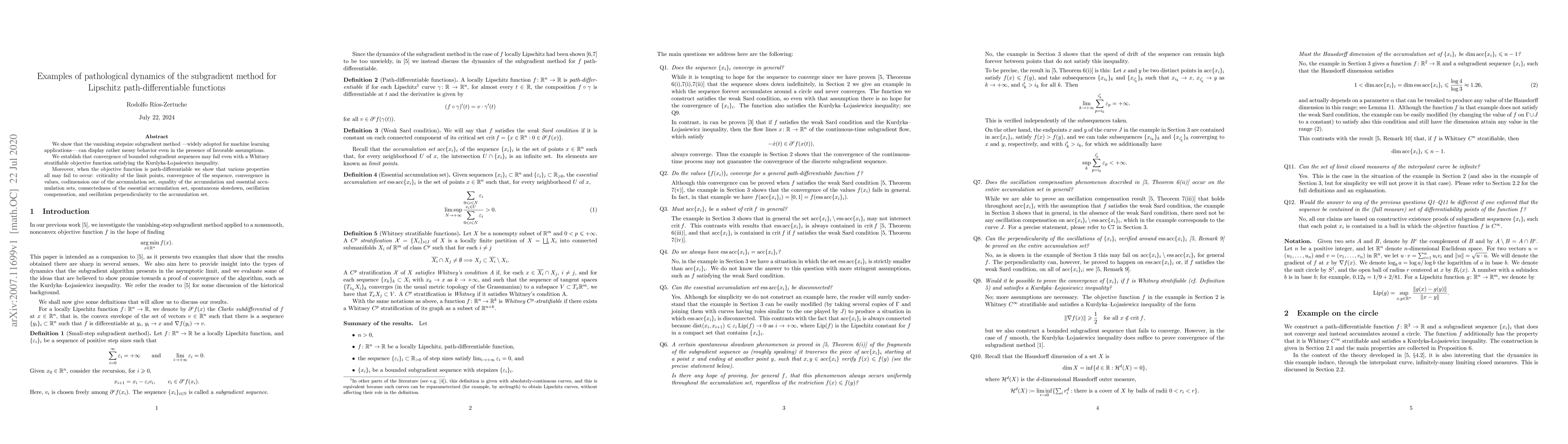 We show that the vanishing stepsize subgradient method -- widely adopted for machine learning applications -- can display rather messy behavior even in the presence of favorable assumptions. We establish that convergence of bounded subgradient sequences may fail even with a Whitney stratifiable objective function satisfying the Kurdyka-Lojasiewicz inequality. Moreover, when the objective function is path-differentiable we show that various properties all may fail to occur: criticality of the limit points, convergence of the sequence, convergence in values, codimension one of the accumulation set, equality of the accumulation and essential accumulation sets, connectedness of the essential accumulation set, spontaneous slowdown, oscillation compensation, and oscillation perpendicularity to the accumulation set.