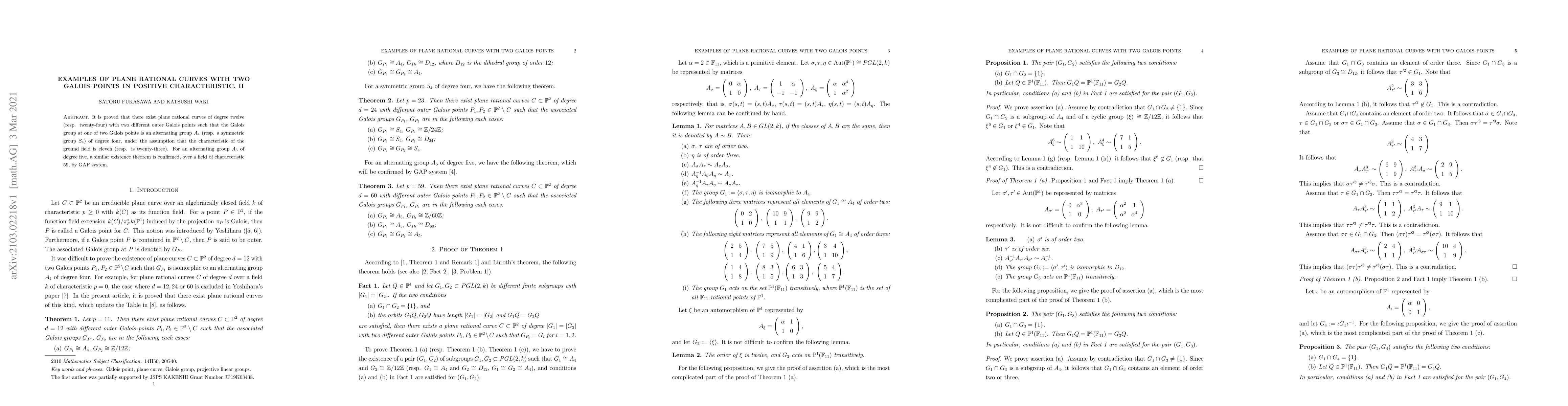 This paper proves the existence of plane rational curves of degree twelve and twenty-four with two distinct outer Galois points in fields of characteristic eleven and twenty-three, respectively, where the Galois group at one point is $A_4$ or $S_4$. Additionally, it confirms the existence of a curve with an $A_5$ Galois group in characteristic fifty-nine using the GAP system.