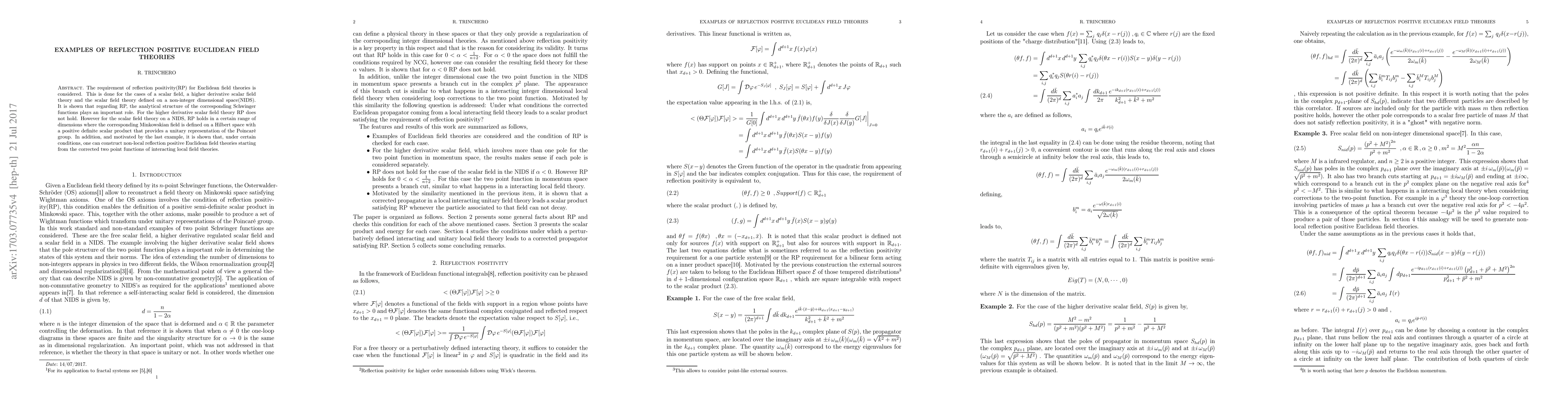 This paper examines reflection positivity in Euclidean field theories, focusing on scalar fields, higher derivative scalar fields, and fields on non-integer dimensional spaces. It finds that reflection positivity does not hold for higher derivative theories but is valid for scalar fields in certain non-integer dimensions, and proposes constructing non-local reflection positive theories from corrected two-point functions of local interacting field theories.