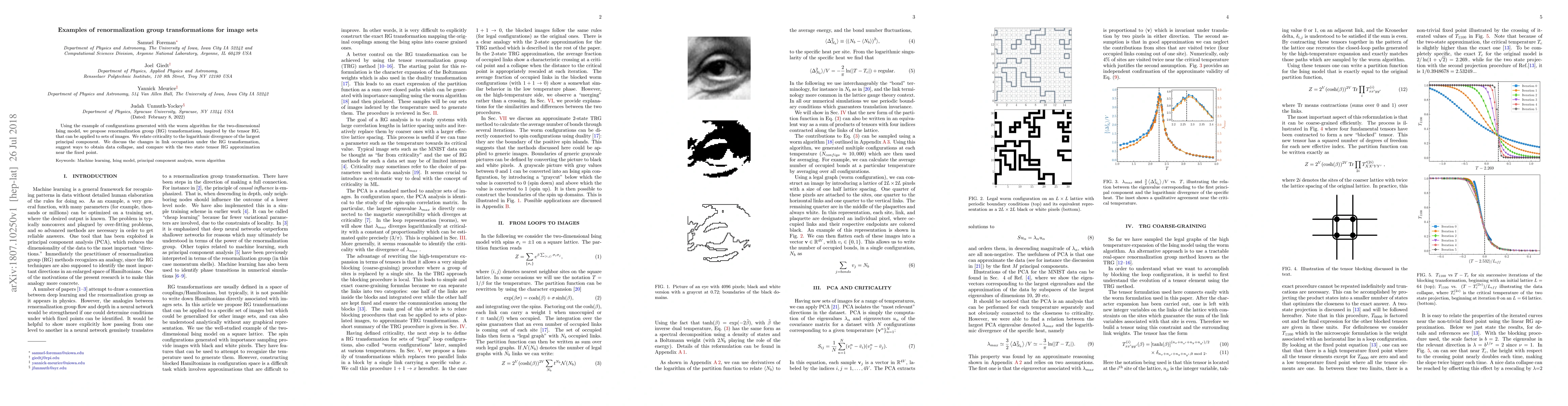 Researchers propose a method to apply renormalization group transformations to sets of images using the two-dimensional Ising model as an example. They relate criticality to the largest principal component's logarithmic divergence and discuss data collapse strategies.