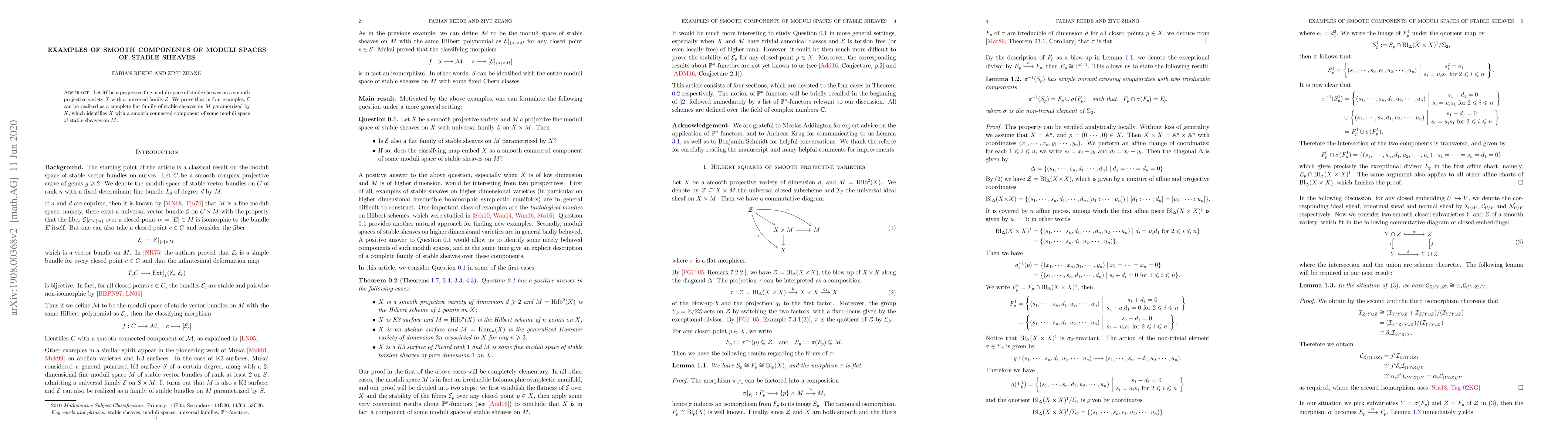 The paper proves that in four specific examples, the universal family of stable sheaves on a projective variety can be realized as a complete flat family on the moduli space of stable sheaves, identifying the variety with a smooth connected component of the moduli space. This demonstrates the existence of smooth components in these moduli spaces.
