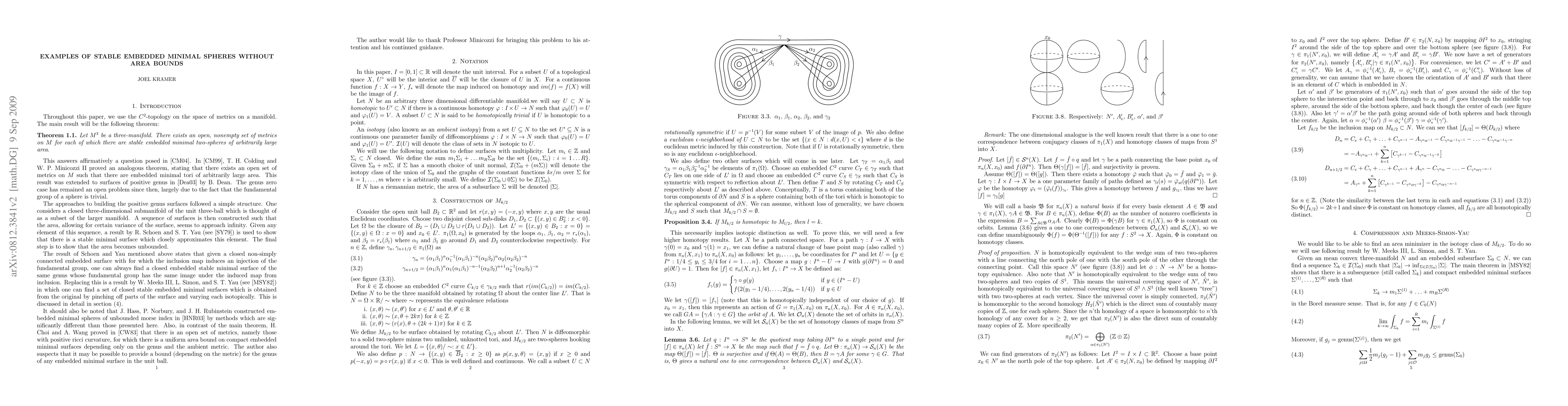 The author proves that there is an open non empty set of metrics on any 3-manifold such that there exists a family of stably embedded minimal 2-spheres whose area is unbounded. This generalizes the work of T. Colding and W. Minicozzi who have shown an analogous result for the torus and B. Dean who showed the positive genus case.