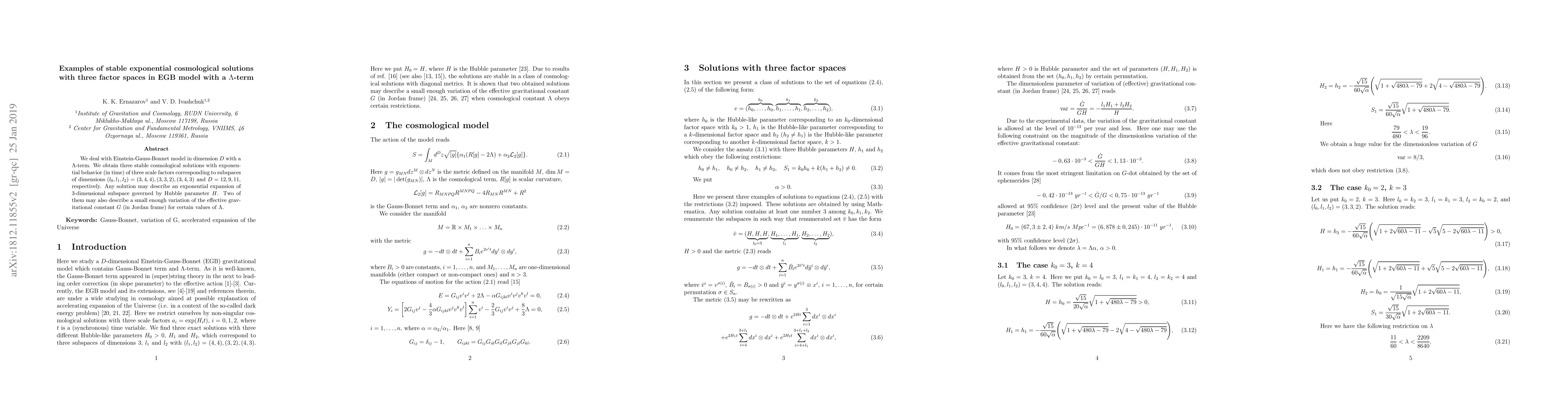 This paper explores stable exponential cosmological solutions in the Einstein-Gauss-Bonnet model with a $\Lambda$-term, identifying three solutions with distinct dimensional subspaces and corresponding dimensions. These solutions may describe exponential expansion in 3-dimensional subspaces and variations in the effective gravitational constant.