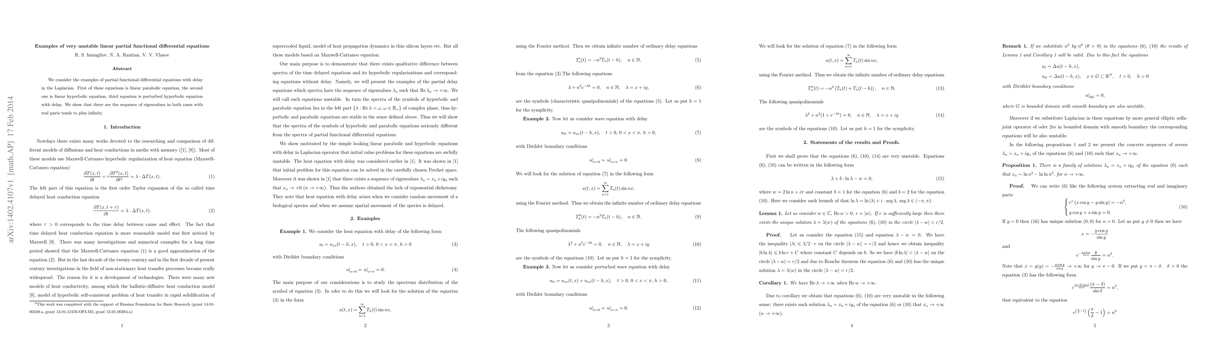 Summary: This paper examines examples of unstable linear partial functional differential equations with delays, including a linear parabolic and a hyperbolic equation, and a perturbed hyperbolic equation. It demonstrates that each has a sequence of eigenvalues with real parts tending to plus infinity.