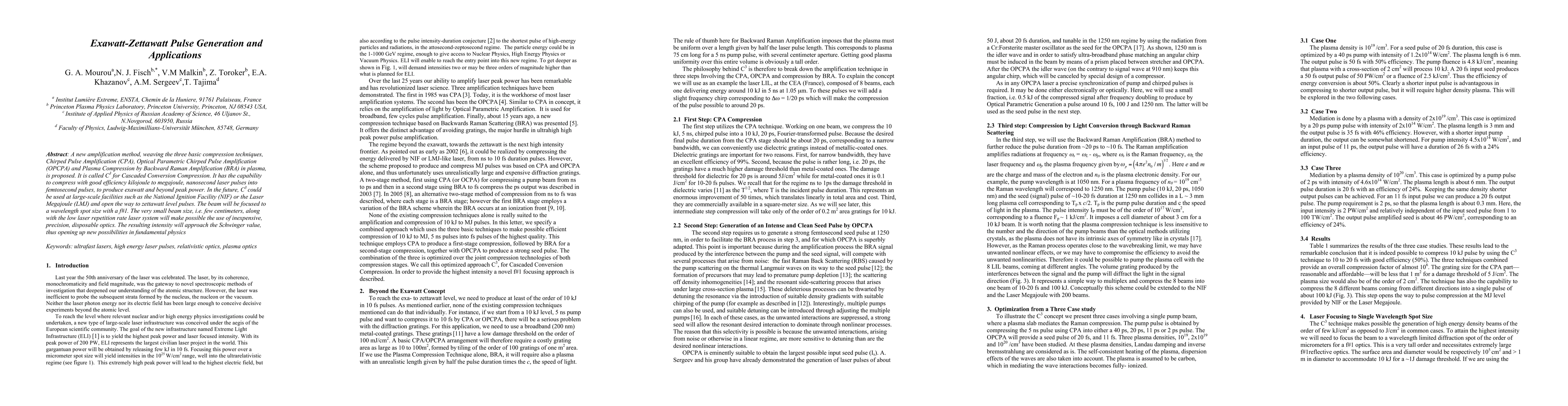 A new amplification method, weaving the three basic compression techniques, Chirped Pulse Amplification (CPA), Optical Parametric Chirped Pulse Amplification (OPCPA) and Plasma Compression by Backward Raman Amplification (BRA) in plasma, is proposed. It is called C3 for Cascaded Conversion Compression. It has the capability to compress with good efficiency kilojoule to megajoule, nanosecond laser pulses into femtosecond pulses, to produce exawatt and beyond peak power. In the future, C3 could be used at large-scale facilities such as the National Ignition Facility (NIF) or the Laser Megajoule (LMJ) and open the way to zettawatt level pulses. The beam will be focused to a wavelength spot size with a f#1. The very small beam size, i.e. few centimeters, along with the low laser repetition rate laser system will make possible the use of inexpensive, precision, disposable optics. The resulting intensity will approach the Schwinger value, thus opening up new possibilities in fundamental physics.