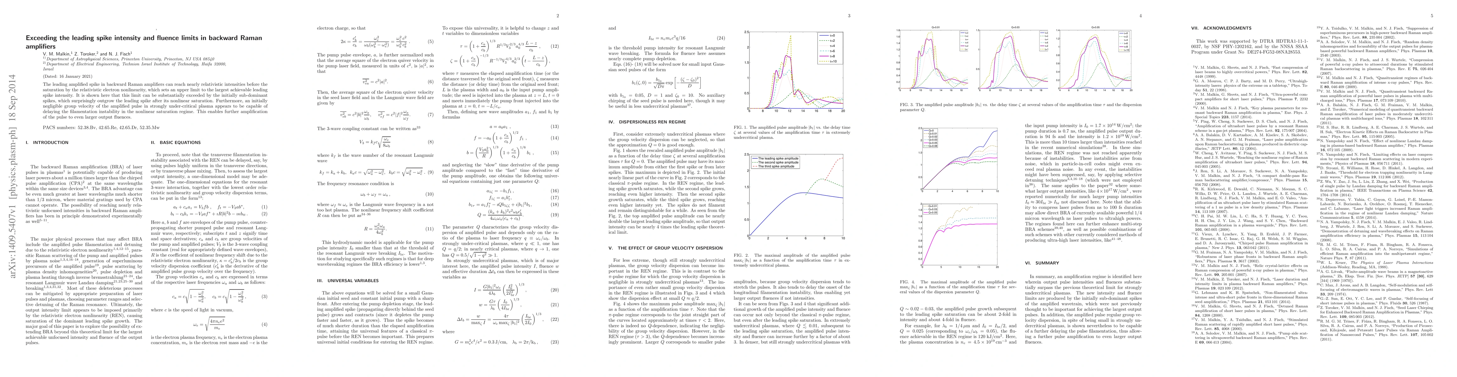 This paper demonstrates that in backward Raman amplifiers, sub-dominant spikes can surpass the leading spike's intensity limit set by relativistic electron nonlinearity, achieving higher intensities. Additionally, a slow group velocity in under-critical plasma can delay filamentation, allowing for further amplification to greater output fluences.