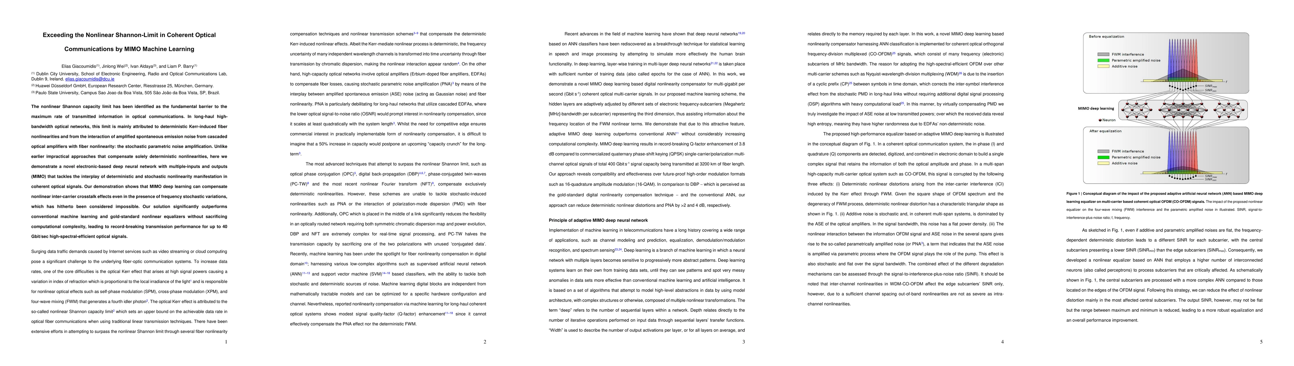 The nonlinear Shannon capacity limit has been identified as the fundamental barrier to the maximum rate of transmitted information in optical communications. In long-haul high-bandwidth optical networks, this limit is mainly attributed to deterministic Kerr-induced fiber nonlinearities and from the interaction of amplified spontaneous emission noise from cascaded optical amplifiers with fiber nonlinearity: the stochastic parametric noise amplification. Unlike earlier impractical approaches that compensate solely deterministic nonlinearities, here we demonstrate a novel electronic-based deep neural network with multiple-inputs and outputs (MIMO) that tackles the interplay of deterministic and stochastic nonlinearity manifestation in coherent optical signals. Our demonstration shows that MIMO deep learning can compensate nonlinear inter-carrier crosstalk effects even in the presence of frequency stochastic variations, which has hitherto been considered impossible. Our solution significantly outperforms conventional machine learning and gold-standard nonlinear equalizers without sacrificing computational complexity, leading to record-breaking transmission performance for up to 40 Gbit/sec high-spectral-efficient optical signals.
