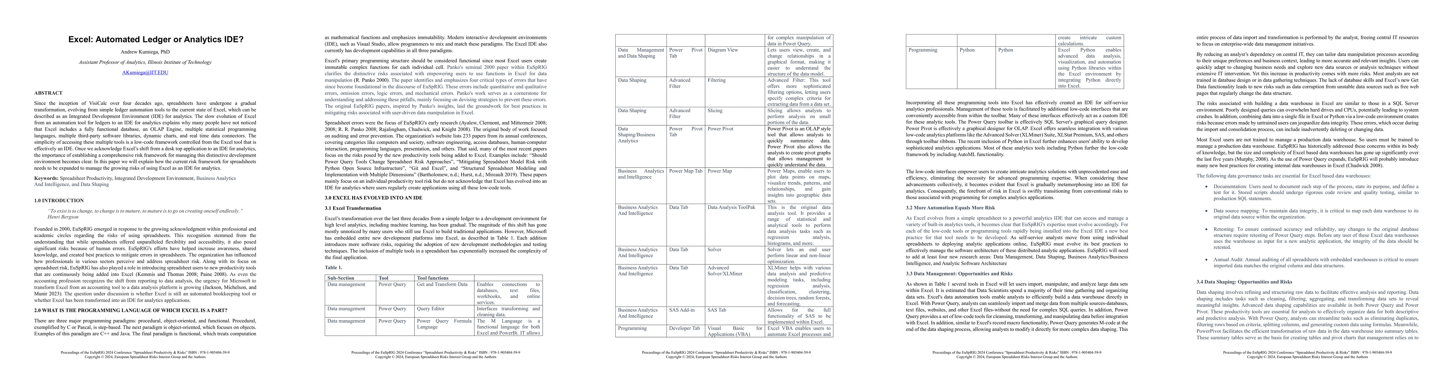 This paper explores Excel's evolution from a ledger automation tool to an Integrated Development Environment (IDE) for analytics, highlighting its multifaceted capabilities. It argues for a comprehensive risk framework to manage the growing risks associated with Excel's expanded role in analytics.