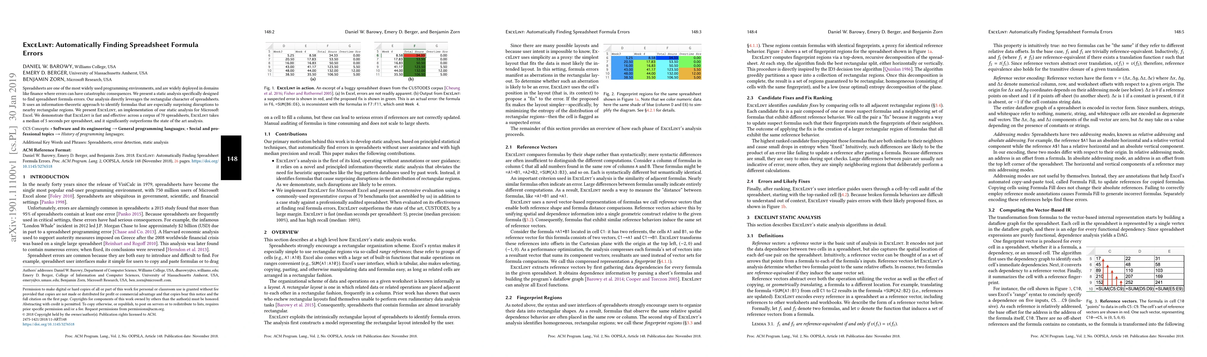 ExceLint introduces an information-theoretic approach to static analysis for identifying spreadsheet formula errors, utilizing the rectangular structure of spreadsheets and employing various optimizations for efficiency.