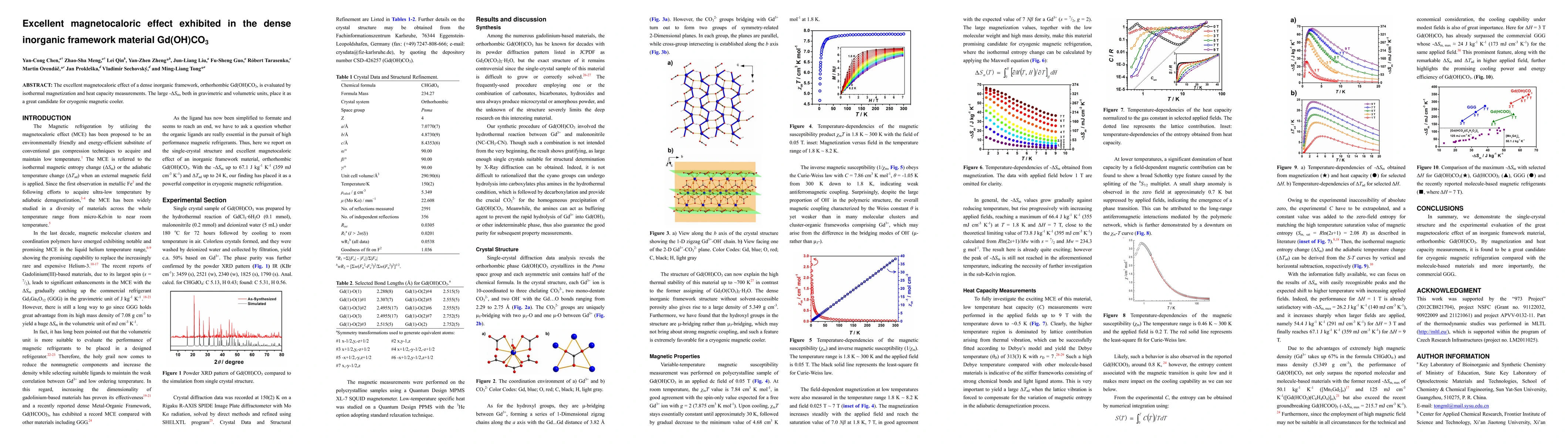 Summary: The study evaluates the magnetocaloric effect in Gd(OH)CO3, revealing significant entropy change and positioning it as a promising material for cryogenic magnetic cooling applications. Its large entropy change in both gravimetric and volumetric units highlights its potential for efficient cooling systems.
