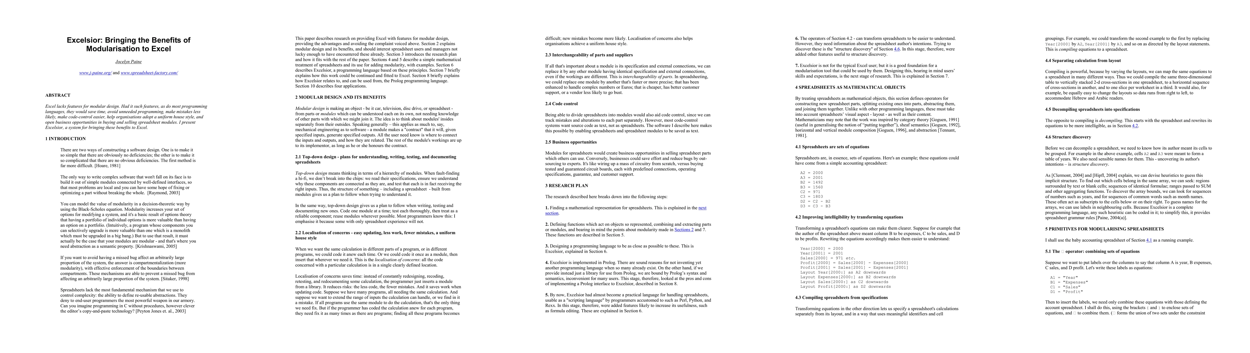 Excel lacks features for modular design. Had it such features, as do most programming languages, they would save time, avoid unneeded programming, make mistakes less likely, make code-control easier, help organisations adopt a uniform house style, and open business opportunities in buying and selling spreadsheet modules. I present Excelsior, a system for bringing these benefits to Excel.