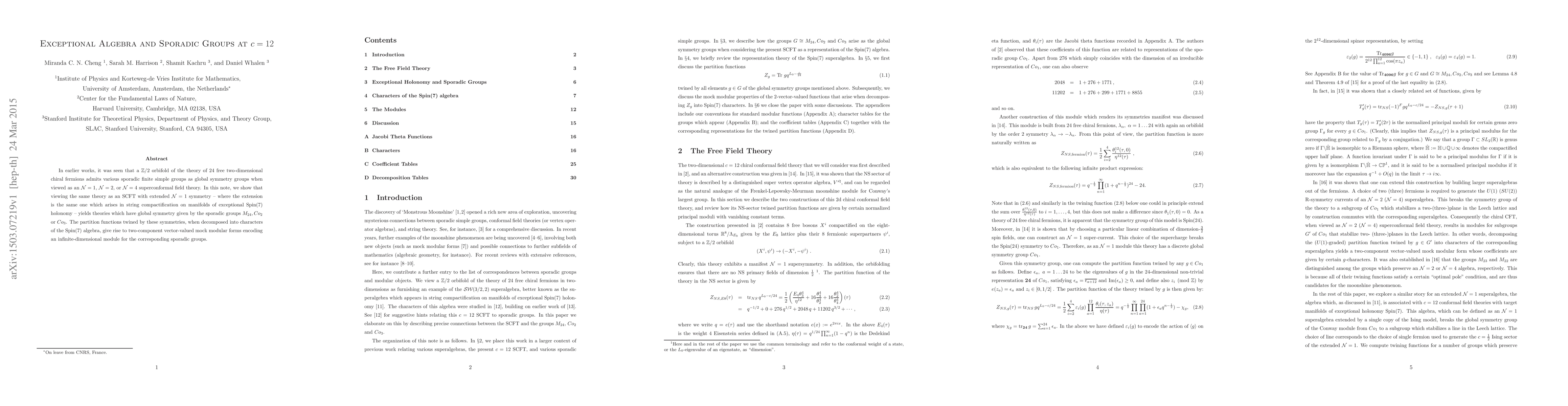 In earlier works, it was seen that a ${\mathbb Z}/2$ orbifold of the theory of 24 free two-dimensional chiral fermions admits various sporadic finite simple groups as global symmetry groups when viewed as an ${\cal N}=1$, ${\cal N}=2$, or ${\cal N}=4$ superconformal field theory. In this note, we show that viewing the same theory as an SCFT with extended ${\cal N}=1$ symmetry -- where the extension is the same one which arises in string compactification on manifolds of exceptional Spin$(7)$ holonomy -- yields theories which have global symmetry given by the sporadic groups $M_{24}, Co_2$ or $Co_3$. The partition functions twined by these symmetries, when decomposed into characters of the Spin(7) algebra, give rise to two-component vector-valued mock modular forms encoding an infinite-dimensional module for the corresponding sporadic groups.