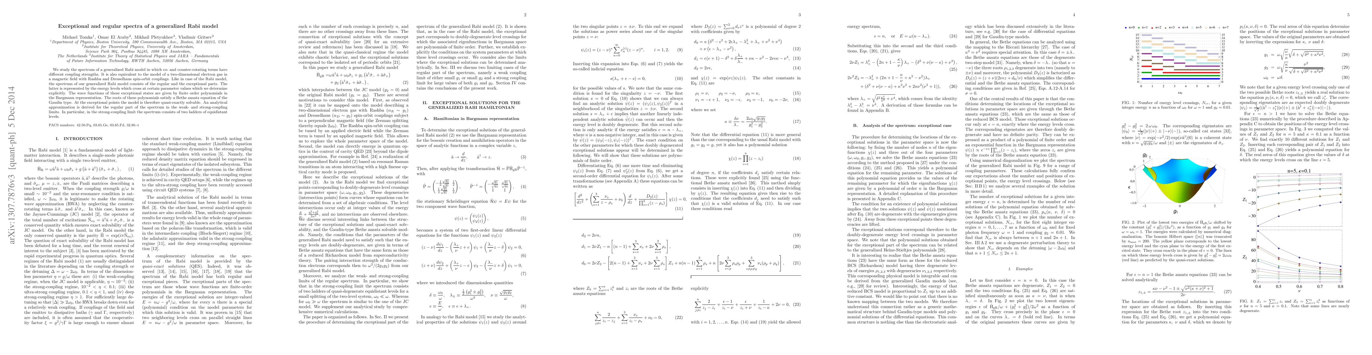 The paper presents a detailed analysis of the generalized Rabi model, identifying its exceptional spectrum and providing analytical approximations for the regular part in limiting cases, as well as expressing the wave functions of exceptional states in terms of finite-order polynomials in the Bargmann representation.