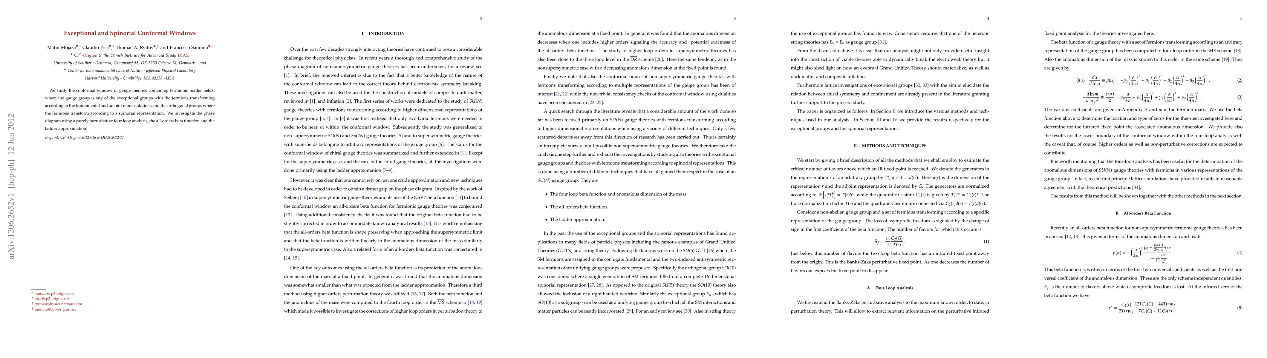 This paper explores the conformal window in gauge theories featuring exceptional and orthogonal groups, focusing on fermions in fundamental, adjoint, and spinorial representations. The study uses perturbative four-loop analysis, all-orders beta function, and ladder approximation to investigate the phase diagram.