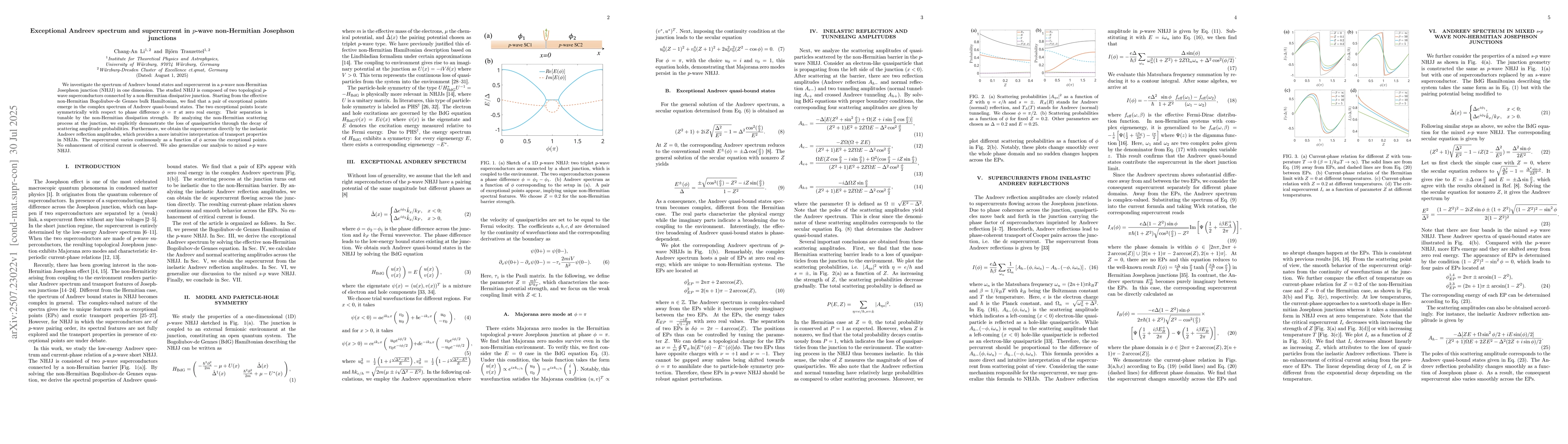 The study investigates the spectrum of Andreev bound states and supercurrent in a one-dimensional p-wave non-Hermitian Josephson junction (NHJJ) using an effective non-Hermitian Bogoliubov-de Gennes bulk Hamiltonian, solving the BdG equation to find exceptional points in the complex spectrum of Andreev quasi-bound states.