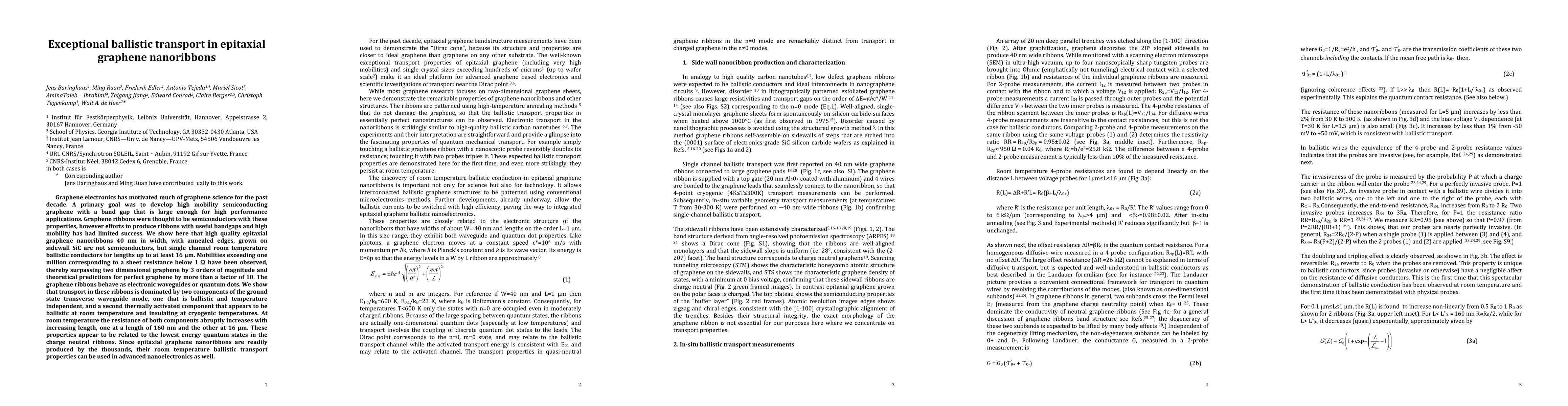 This study demonstrates exceptional ballistic transport in epitaxial graphene nanoribbons, showing mobilities exceeding one million, far surpassing two-dimensional graphene and theoretical predictions. The ribbons, with widths of 40 nm and annealed edges, behave as single channel conductors and exhibit room temperature ballistic transport for lengths up to 16 micrometers, potentially enabling advanced nanoelectronics applications.