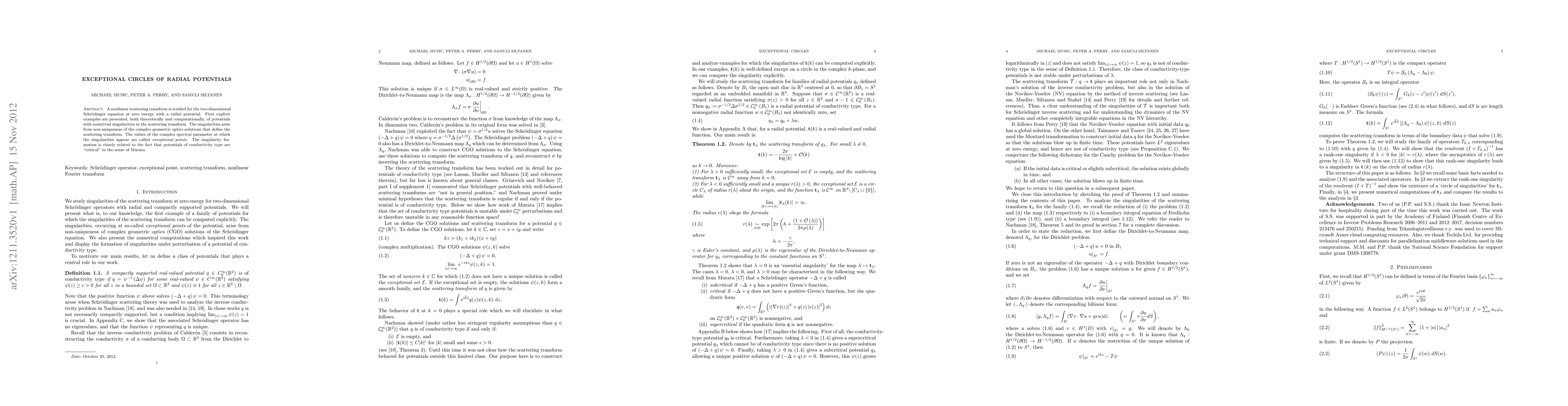 A nonlinear scattering transform is studied for the two-dimensional Schrodinger equation at zero energy with a radial potential. First explicit examples are presented, both theoretically and computationally, of potentials with nontrivial singularities in the scattering transform. The singularities arise from non-uniqueness of the complex geometric optics solutions that define the scattering transform. The values of the complex spectral parameter at which the singularities appear are called exceptional points. The singularity formation is closely related to the fact that potentials of conductivity type are critical in the sense of Murata.