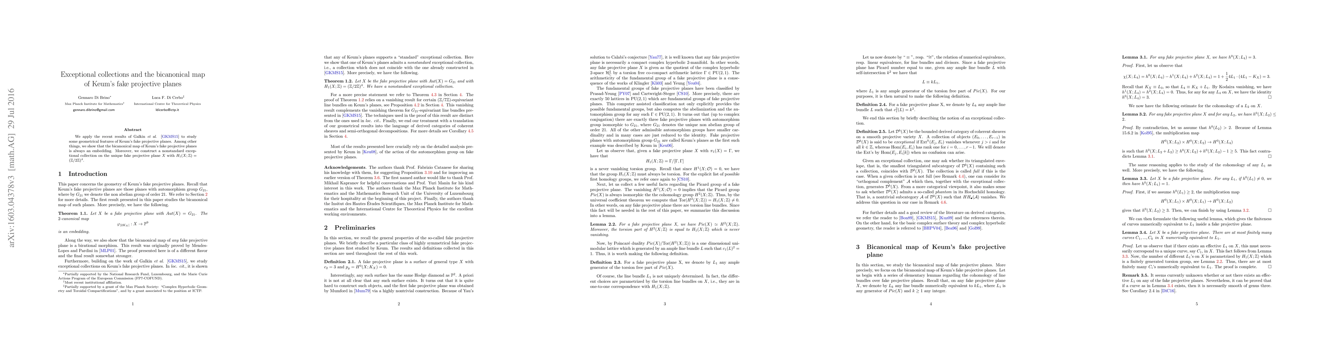 Researchers studied Keum's fake projective planes using recent results to show their bicanonical map is always an embedding, and created a non-standard exceptional collection on the unique plane with a specific homology group.