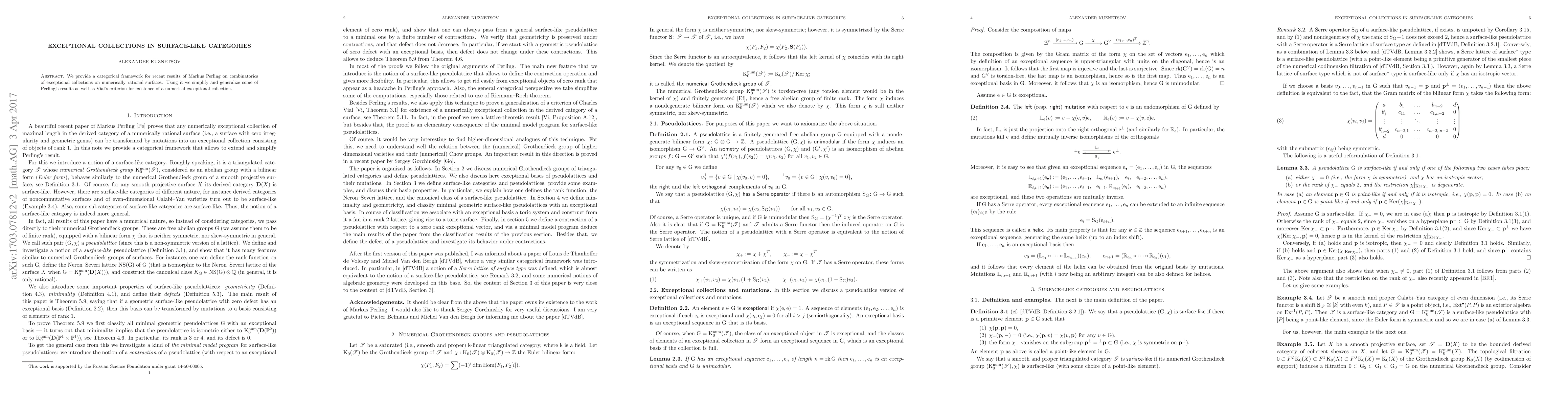 Summary: This paper establishes a categorical framework to simplify and generalize results on exceptional collections on numerically rational surfaces, enhancing both Perling's and Vial's prior findings on the combinatorics and existence criteria of such collections.