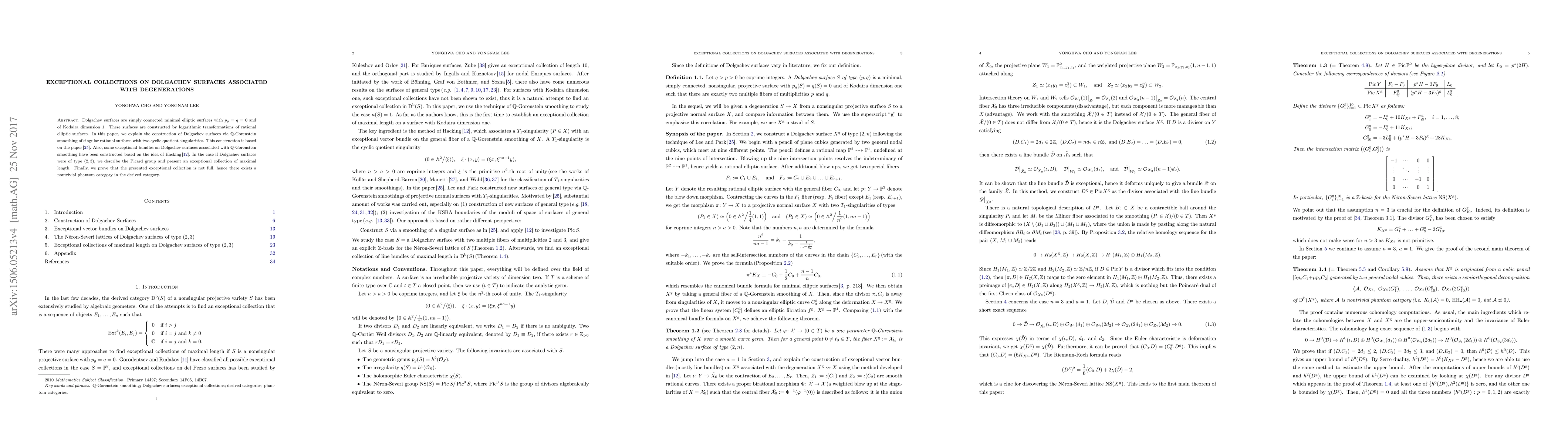 This paper constructs Dolgachev surfaces through $\mathbb Q$-Gorenstein smoothing of singular rational surfaces, detailing exceptional bundles and presenting an exceptional collection of maximal length for type $(2,3)$ surfaces. It concludes that this collection is not full, indicating a nontrivial phantom category in the derived category.