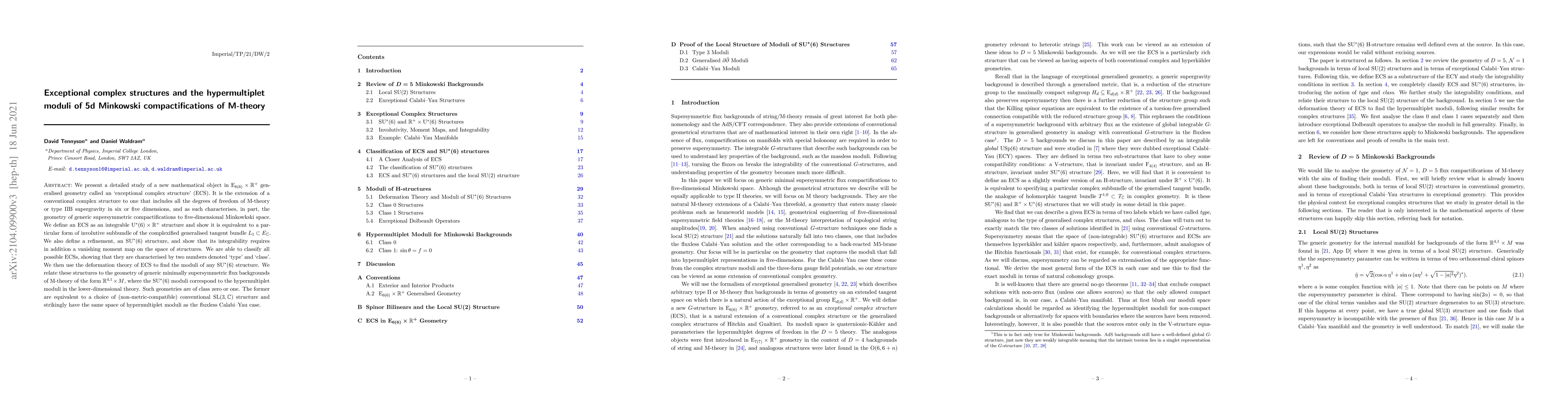 This paper introduces the concept of an exceptional complex structure (ECS) in generalised geometry and classifies all possible ECSs characterized by type and class. The study connects these structures to the hypermultiplet moduli in five-dimensional Minkowski compactifications of M-theory, revealing that class zero ECSs have the same moduli space as the fluxless Calabi-Yau case.