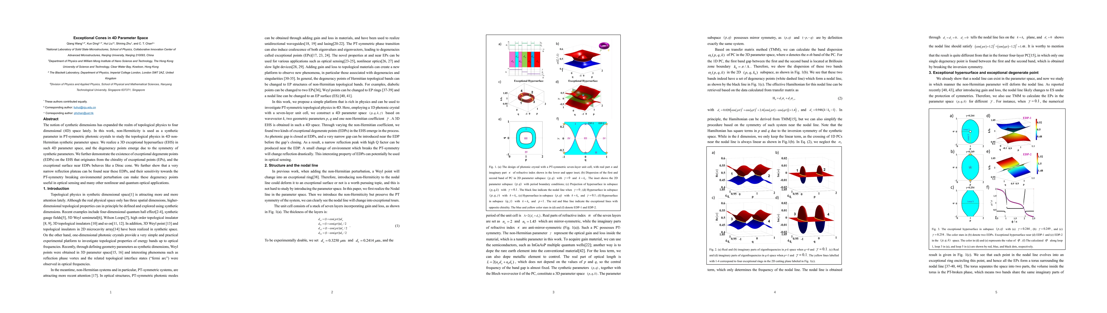 This paper explores the topological physics in 4D non-Hermitian synthetic parameter space using PT-symmetric photonic crystals, identifying a 3D exceptional hypersurface (EHS) and exceptional degenerate points (EDPs) that exhibit Dirac cone behavior. These EDPs are sensitive to PT-symmetry breaking, making them valuable for optical sensing and various nonlinear and quantum optical applications.