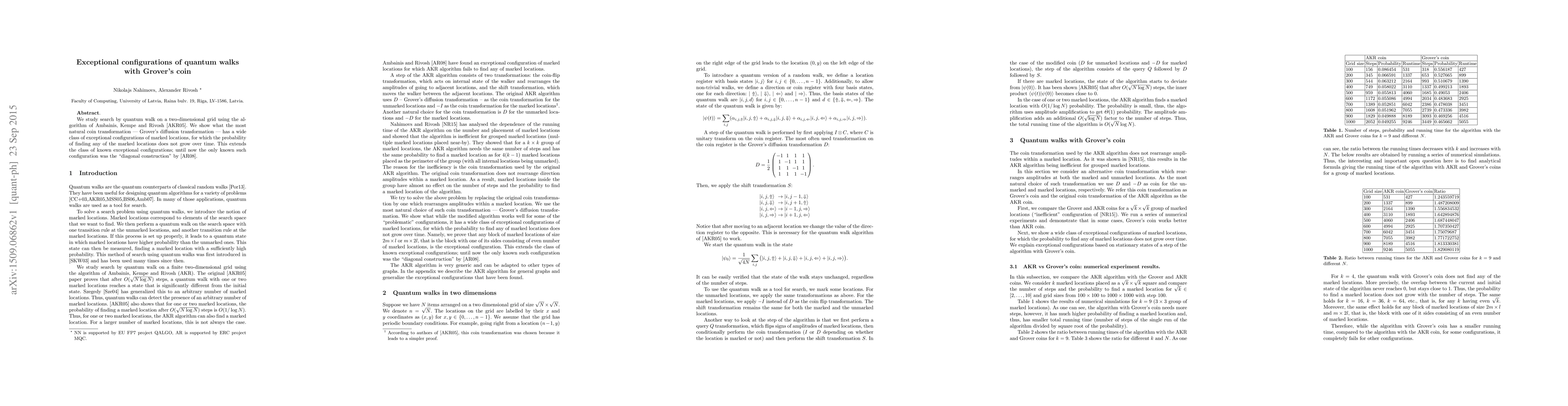 We study search by quantum walk on a two-dimensional grid using the algorithm of Ambainis, Kempe and Rivosh [AKR05]. We show what the most natural coin transformation - Grover's diffusion transformation - has a wide class of exceptional configurations of marked locations, for which the probability of finding any of the marked locations does not grow over time. This extends the class of known exceptional configurations; until now the only known such configuration was the "diagonal construction" by Ambainis and Rivosh [AR08]