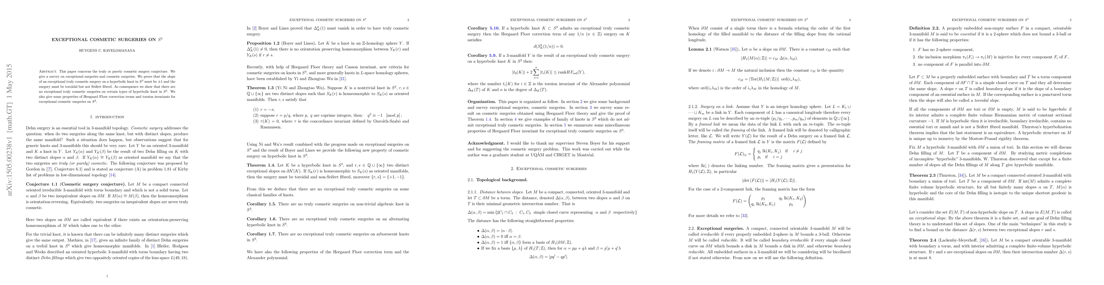 The paper establishes conditions under which exceptional truly cosmetic surgeries on hyperbolic knots in $S^3$ occur, leveraging advanced concepts from Heegaard Floer theory and Thurston norm.