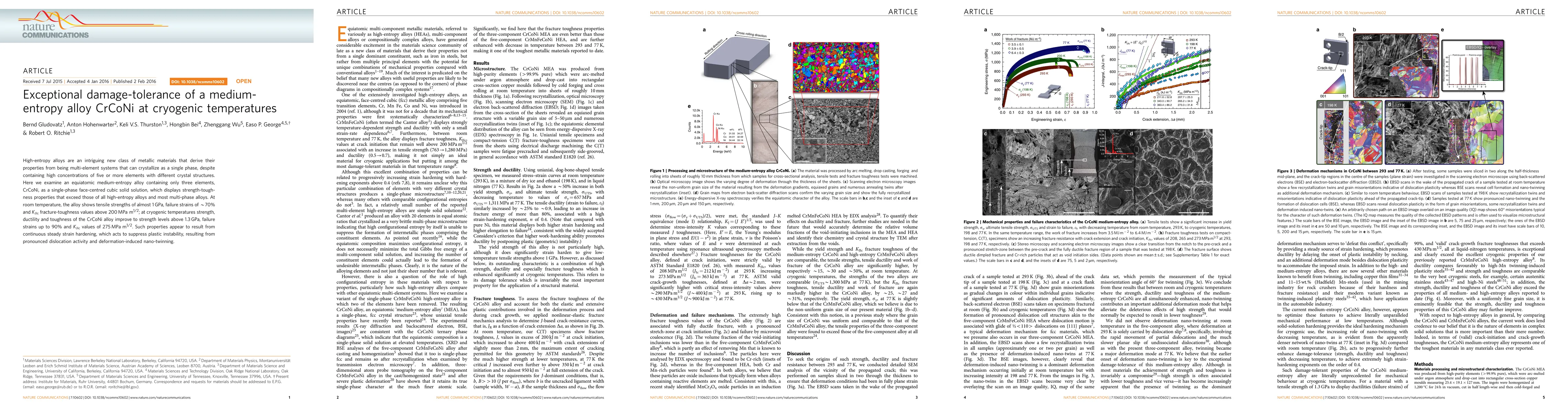 This study investigates the exceptional damage-tolerance of the medium-entropy alloy CrCoNi at cryogenic temperatures, revealing enhanced strength, ductility, and toughness due to continuous strain hardening and dislocation activity. The alloy's superior properties surpass those of high-entropy alloys and most multi-phase alloys.