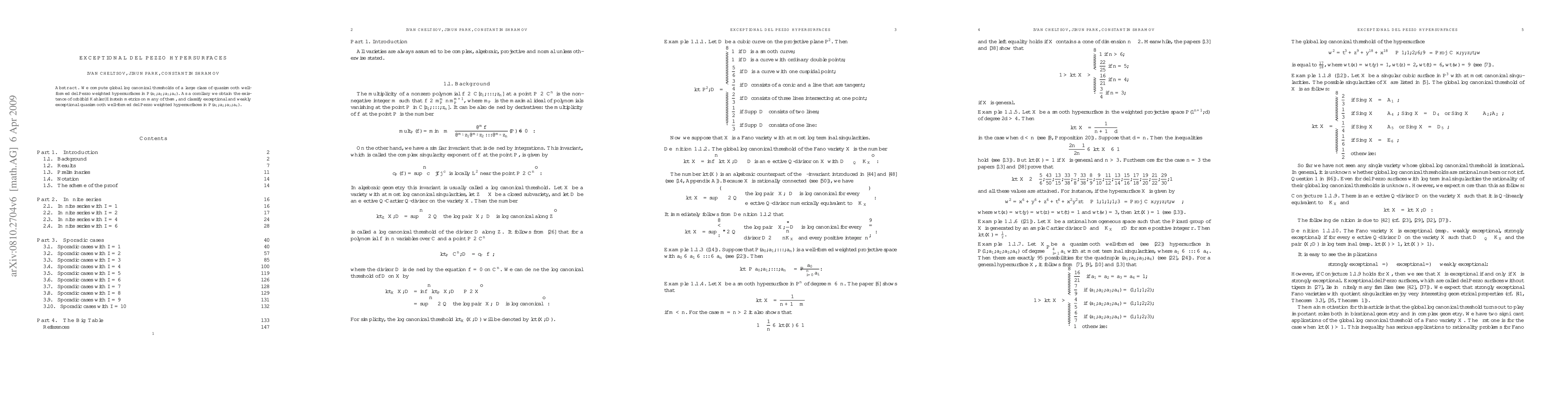 We compute global log canonical thresholds of a large class of quasismooth well-formed del Pezzo weighted hypersurfaces in $\mathbb{P}(a_{1},a_{2},a_{3},a_{4})$. As a corollary we obtain the existence of orbifold K\"ahler--Einstein metrics on many of them, and classify exceptional and weakly exceptional quasismooth well-formed del Pezzo weighted hypersurfaces in $\mathbb{P}(a_{1},a_{2},a_{3},a_{4})$.