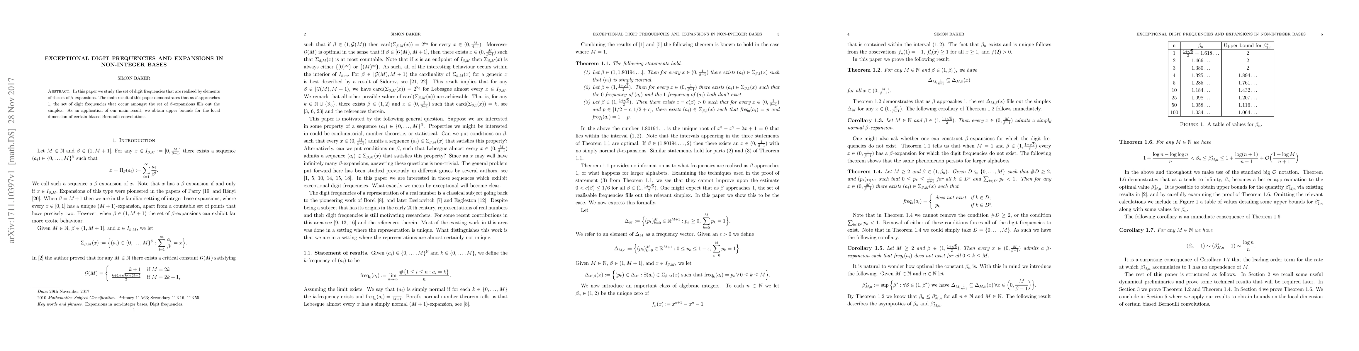 This paper explores how digit frequencies in non-integer bases behave as the base approaches 1, finding that these frequencies fill out a simplex. It also provides upper bounds for certain biased Bernoulli convolutions.