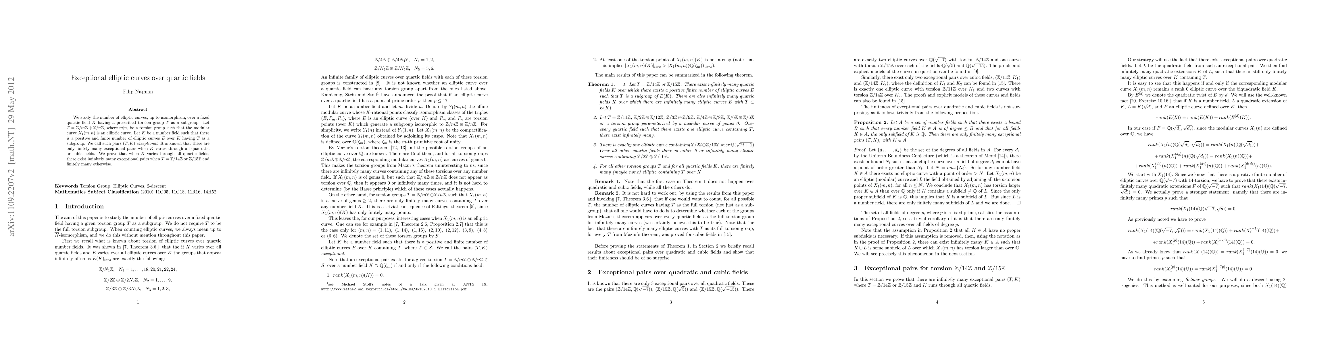 The paper investigates the number of elliptic curves over fixed quartic fields with a specified torsion subgroup. It proves that there are infinitely many "exceptional" pairs of elliptic curves and quartic fields when the torsion group is $\Z/14\Z$ or $\Z/15\Z$, but only finitely many otherwise.