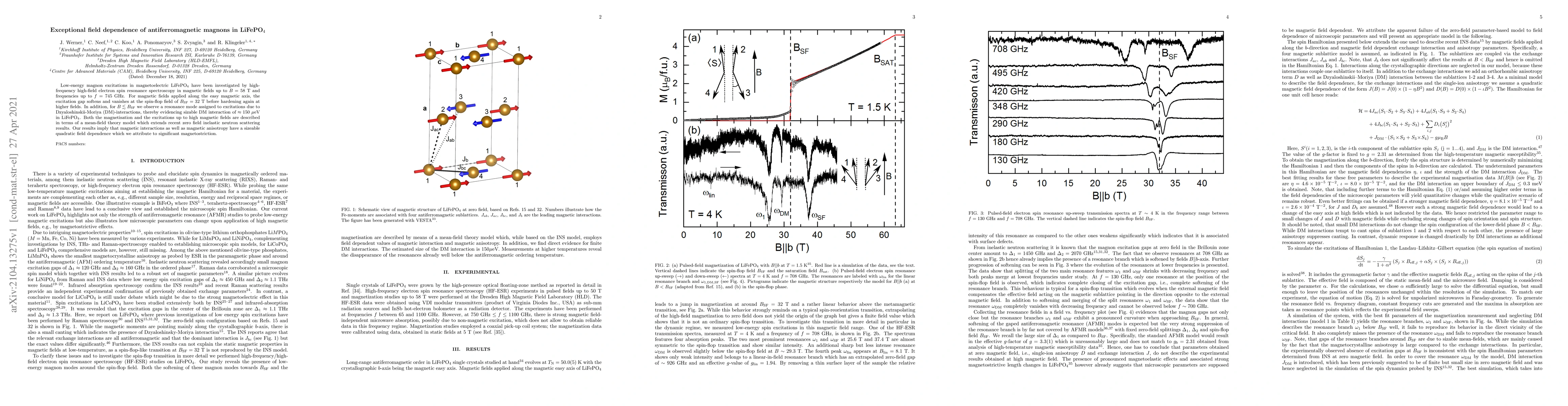 Low-energy magnon excitations in magnetoelectric LiFePO$_4$ have been investigated by high-frequency high-field electron spin resonance spectroscopy in magnetic fields up to B = 58 T and frequencies up to f = 745 GHz. For magnetic fields applied along the easy magnetic axis, the excitation gap softens and vanishes at the spin-flop field of BSF = 32 T before hardening again at higher fields. In addition, for B smaller than BSF we observe a resonance mode assigned to excitations due to Dzyaloshinskii-Moriya (DM)-interactions, thereby evidencing sizable DM interaction of approx 150 micro eV in LiFePO4. Both the magnetisation and the excitations up to high magnetic fields are described in terms of a mean-field theory model which extends recent zero field inelastic neutron scattering results. Our results imply that magnetic interactions as well as magnetic anisotropy have a sizable quadratic field dependence which we attribute to significant magnetostriction.