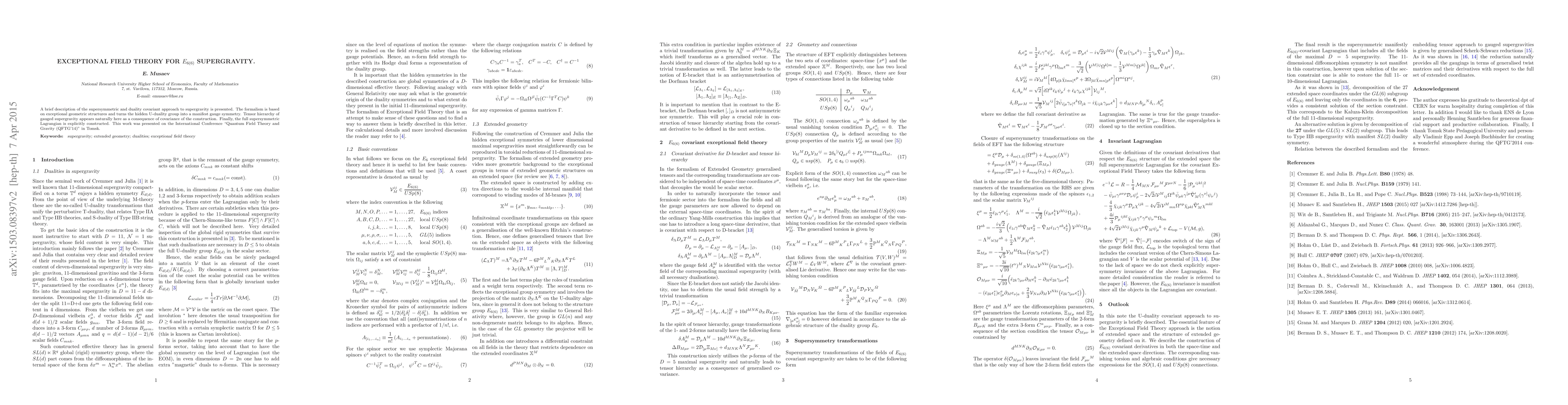 A brief description of the supersymmetric and duality covariant approach to supergravity is presented. The formalism is based on exceptional geometric structures and turns the hidden U-duality group into a manifest gauge symmetry. Tensor hierarchy of gauged supergravity appears naturally here as a consequence of covariance of the construction. Finally, the full supersymmetric Lagrangian is explicitly constructed. This work was presented on the International Conference "Quantum Field Theory and Gravity (QFTG'14)" in Tomsk.