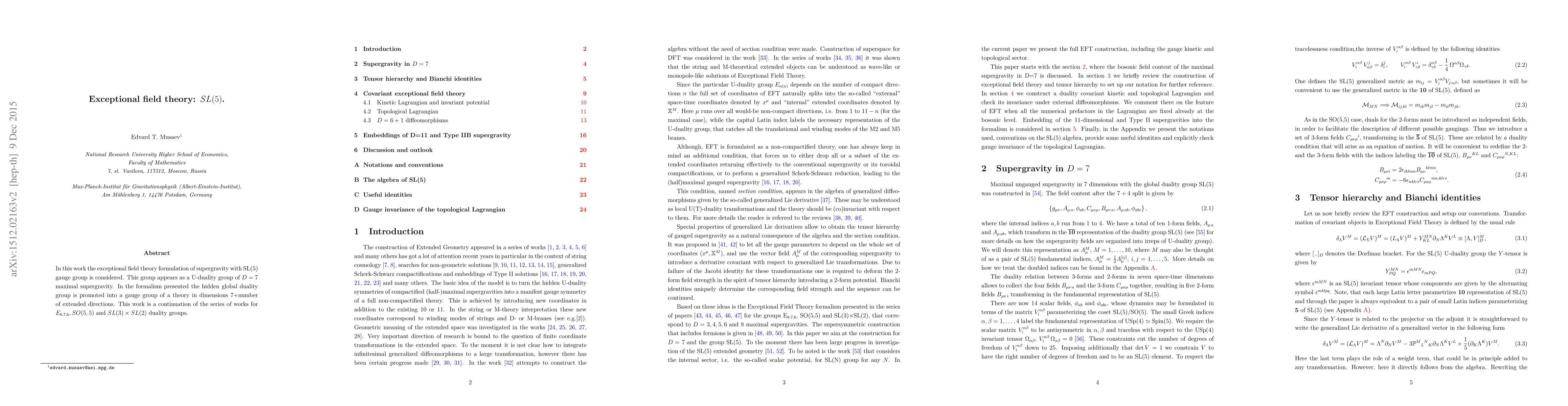 In this work the exceptional field theory formulation of supergravity with SL(5) gauge group is considered. This group appears as a U-duality group of $D=7$ maximal supergravity. In the formalism presented the hidden global duality group is promoted into a gauge group of a theory in dimensions 7+number of extended directions. This work is a continuation of the series of works for $E_{8,7,6}, SO(5,5)$ and $SL(3)\times SL(2)$ duality groups.