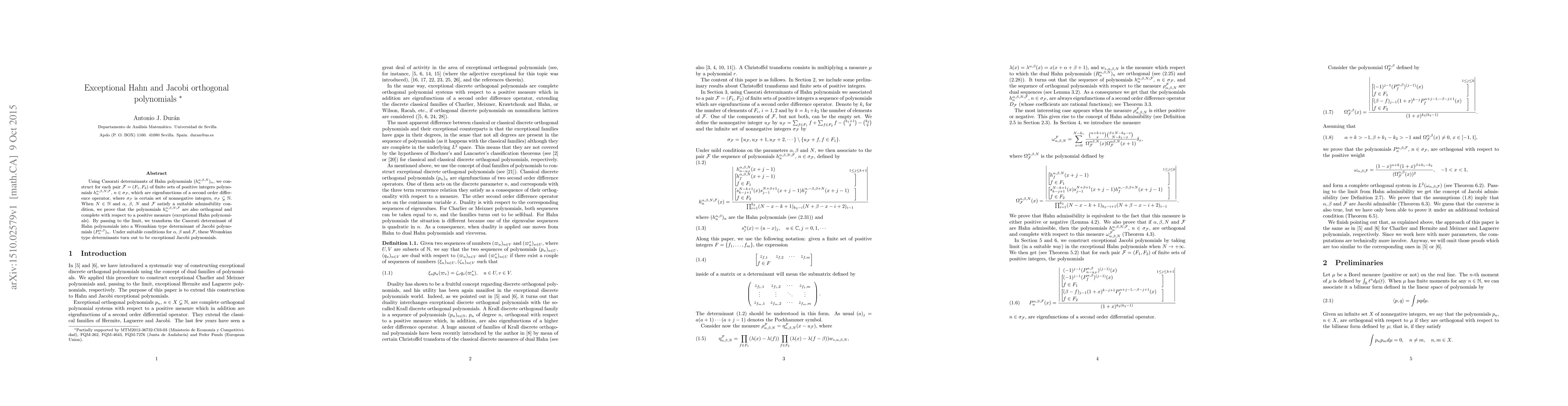 Using Casorati determinants of Hahn polynomials $(h_n^{\alpha,\beta,N})_n$, we construct for each pair $\F=(F_1,F_2)$ of finite sets of positive integers polynomials $h_n^{\alpha,\beta,N;\F}$, $n\in \sigma _\F$, which are eigenfunctions of a second order difference operator, where $\sigma _\F$ is certain set of nonnegative integers, $\sigma _\F \varsubsetneq \NN$. When $N\in \NN$ and $\alpha$, $\beta$, $N$ and $\F$ satisfy a suitable admissibility condition, we prove that the polynomials $h_n^{\alpha,\beta,N;\F}$ are also orthogonal and complete with respect to a positive measure (exceptional Hahn polynomials). By passing to the limit, we transform the Casorati determinant of Hahn polynomials into a Wronskian type determinant of Jacobi polynomials $(P_n^{\alpha,\beta})_n$. Under suitable conditions for $\alpha$, $\beta$ and $\F$, these Wronskian type determinants turn out to be exceptional Jacobi polynomials.