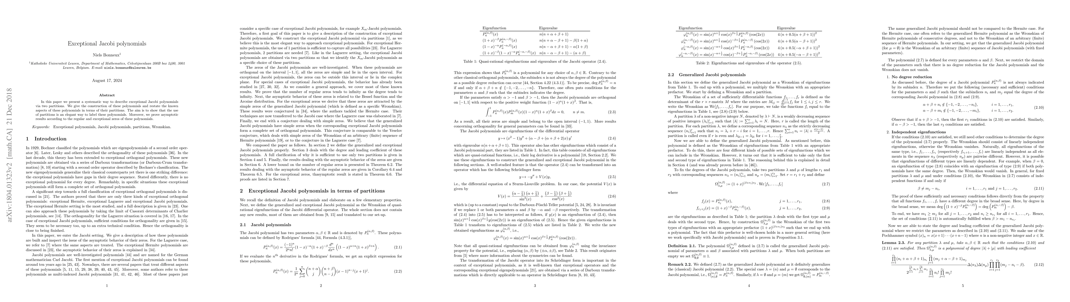 This paper systematically describes exceptional Jacobi polynomials using two partitions, constructing them and proving asymptotic results related to their regular and exceptional zeros, demonstrating the elegance of partition-based labeling.