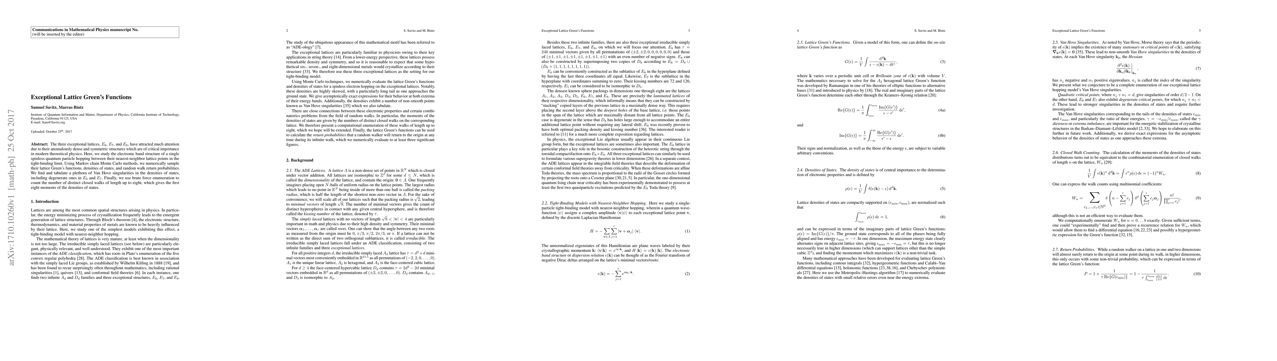 The three exceptional lattices, $E_6$, $E_7$, and $E_8$, have attracted much attention due to their anomalously dense and symmetric structures which are of critical importance in modern theoretical physics. Here, we study the electronic band structure of a single spinless quantum particle hopping between their nearest-neighbor lattice points in the tight-binding limit. Using Markov chain Monte Carlo methods, we numerically sample their lattice Green's functions, densities of states, and random walk return probabilities. We find and tabulate a plethora of Van Hove singularities in the densities of states, including degenerate ones in $E_6$ and $E_7$. Finally, we use brute force enumeration to count the number of distinct closed walks of length up to eight, which gives the first eight moments of the densities of states.