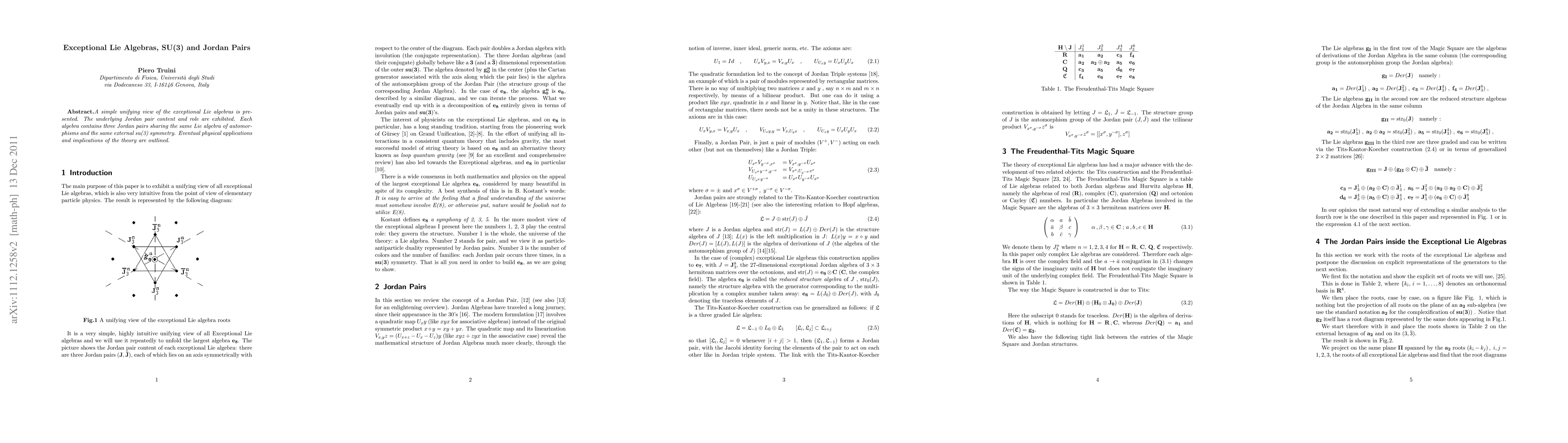 The paper provides a unifying perspective on exceptional Lie algebras, highlighting their shared Jordan pair structure and SU(3) symmetry, with potential physical applications noted. The common Jordan pairs across these algebras reveal deeper algebraic relationships and implications for theoretical physics.