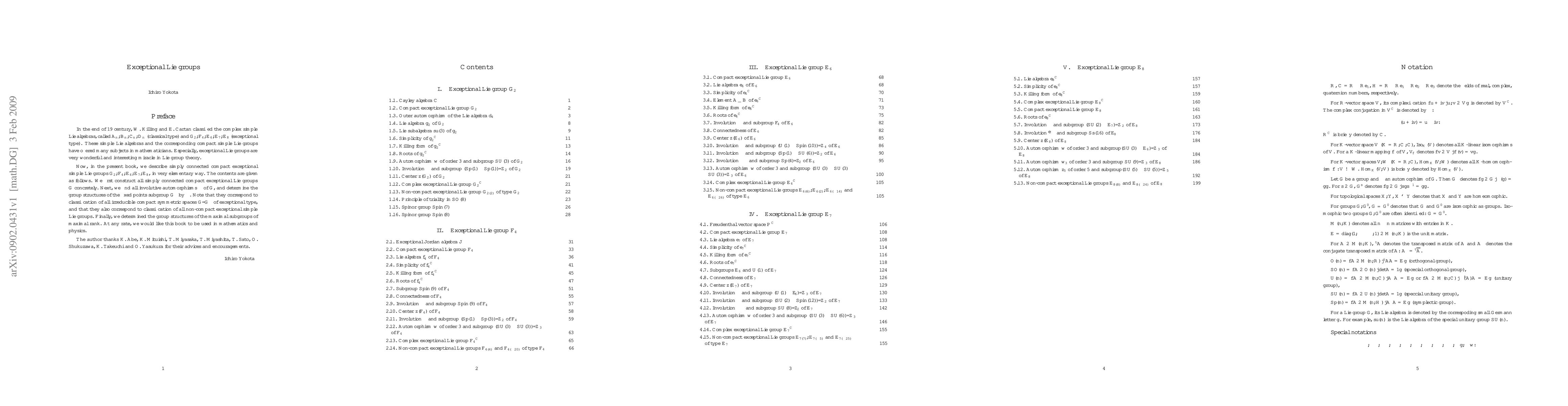 We describe simply connected compact exceptional simple Lie groups in very elementary way. We first construct all simply connected compact exceptional Lie groups G concretely. Next, we find all involutive automorphisms of G, and determine the group structures of the fixed points subgroup. They correspond to the classification of all irreducible compact symmetric spaces of exceptional type, and that they also correspond to classification of all non-compact exceptionalsimple Lie groups. Finally, we determined the group structures of the maximal subgroups of maximal rank. At any rate, we would like this book to be used in mathematics and physics.