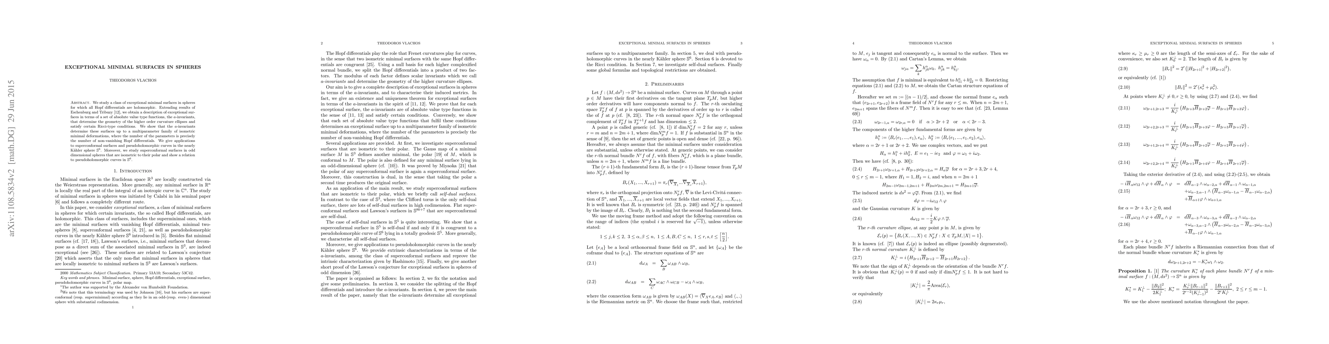 This paper investigates exceptional minimal surfaces in spheres where all Hopf differentials are holomorphic, describing them using $a$-invariants that determine their geometry. It reveals that these surfaces are uniquely determined by their $a$-invariants up to a multiparameter family of isometric deformations, with applications to superconformal surfaces and pseudoholomorphic curves in $S^{6}$.