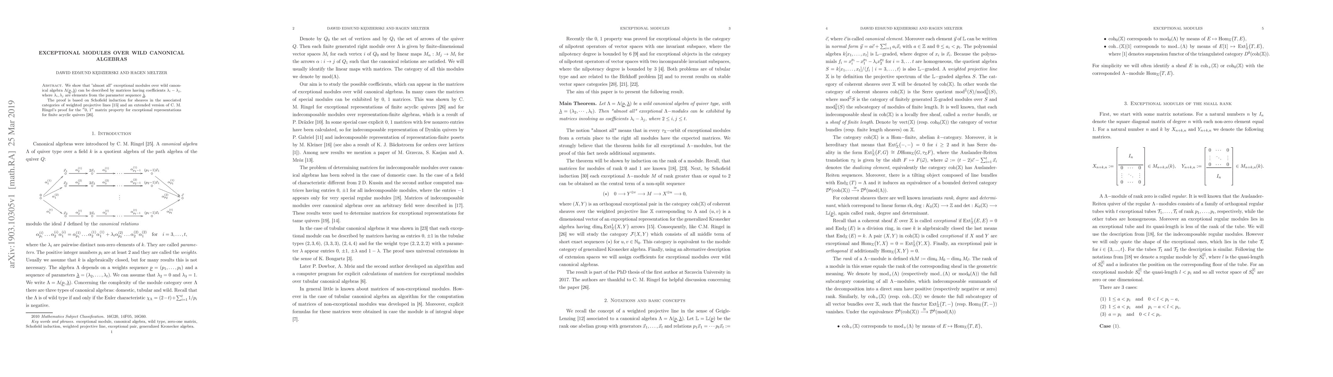 We show that ''almost all'' exceptional modules over wild canonical algebra $\Lambda$ can be described by matrices having coefficients $\lambda_i-\lambda_j$, where $\lambda_i, \lambda_j$ are elements from the parameter sequence. The proof is based on Schofield induction for sheaves in the associated categories of weighted projective lines and an extended version of C. M. Ringel's proof for the $''0, \,1''$ matrix property for exceptional representations for finite acyclic quivers.