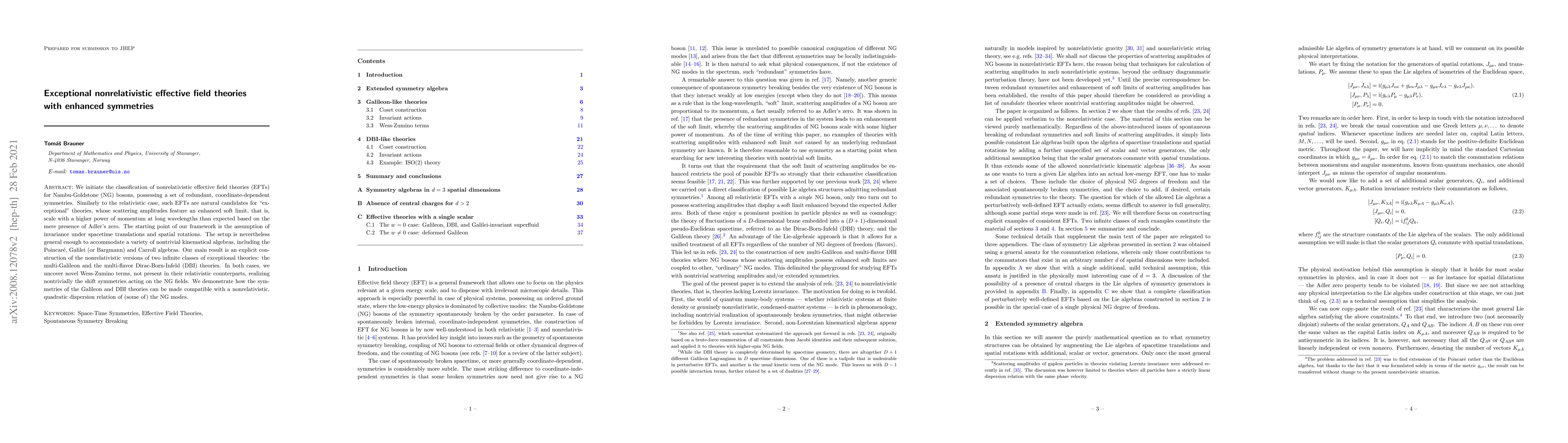 This paper classifies nonrelativistic effective field theories (EFTs) for Nambu-Goldstone bosons with enhanced symmetries, constructing two infinite classes of exceptional theories: multi-Galileon and multi-flavor Dirac-Born-Infeld (DBI) theories, which exhibit novel Wess-Zumino terms and compatible symmetries with nonrelativistic dispersion relations.