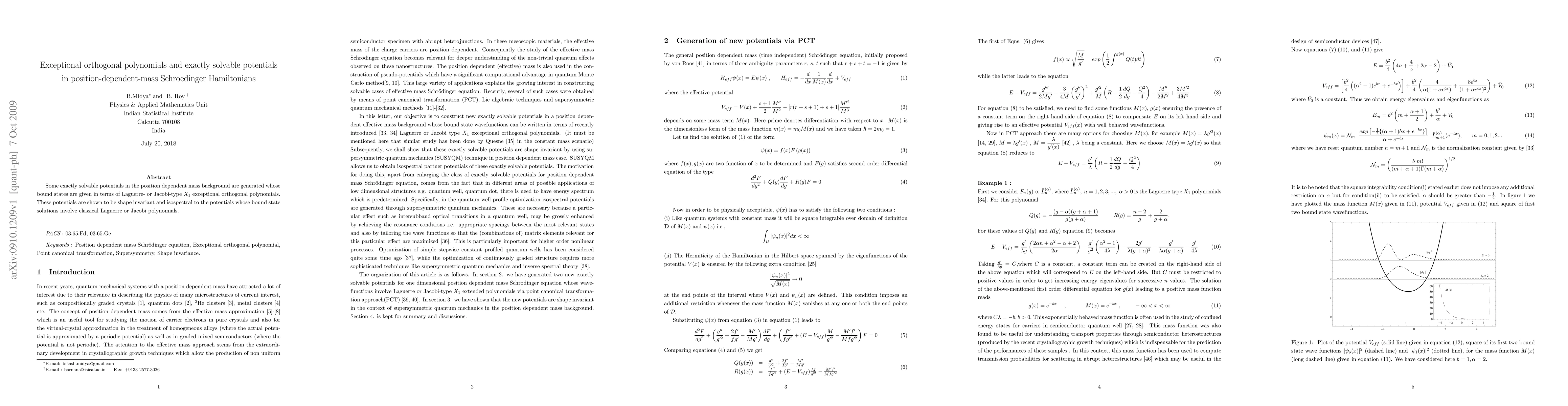 This paper generates exactly solvable potentials in position-dependent mass Schrödinger Hamiltonians, where bound states are expressed using exceptional orthogonal polynomials. These potentials are shape invariant and isospectral to those using classical Laguerre or Jacobi polynomials.