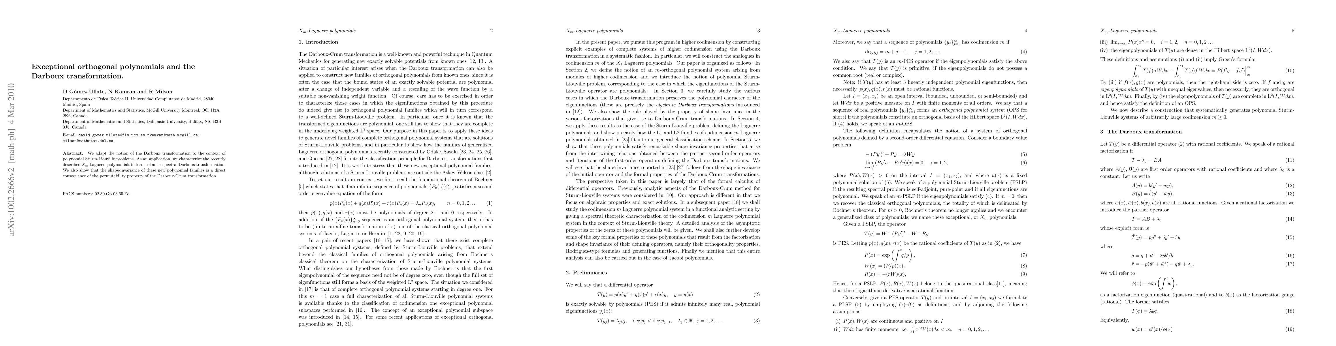 This paper adapts the Darboux transformation to polynomial Sturm-Liouville problems, characterizing $X_m$ Laguerre polynomials through an isospectral transformation and demonstrating their shape-invariance via the permutability property of the Darboux-Crum transformation.