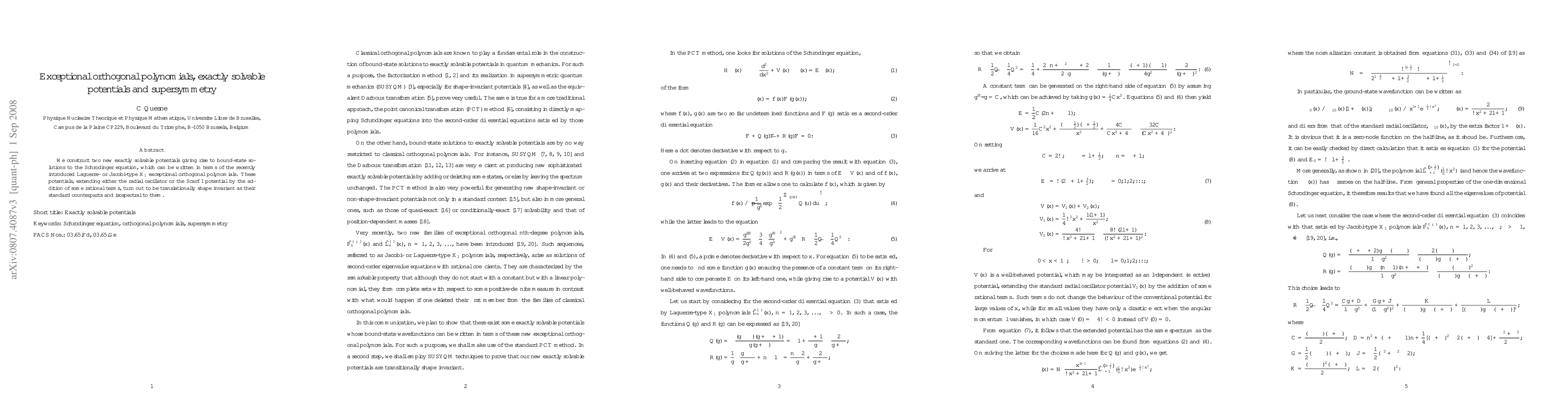 Summary: The paper introduces two new exactly solvable potentials based on exceptional orthogonal polynomials, which are isospectral to standard potentials and exhibit translational shape invariance. These potentials extend the radial oscillator or Scarf I potential with rational terms.