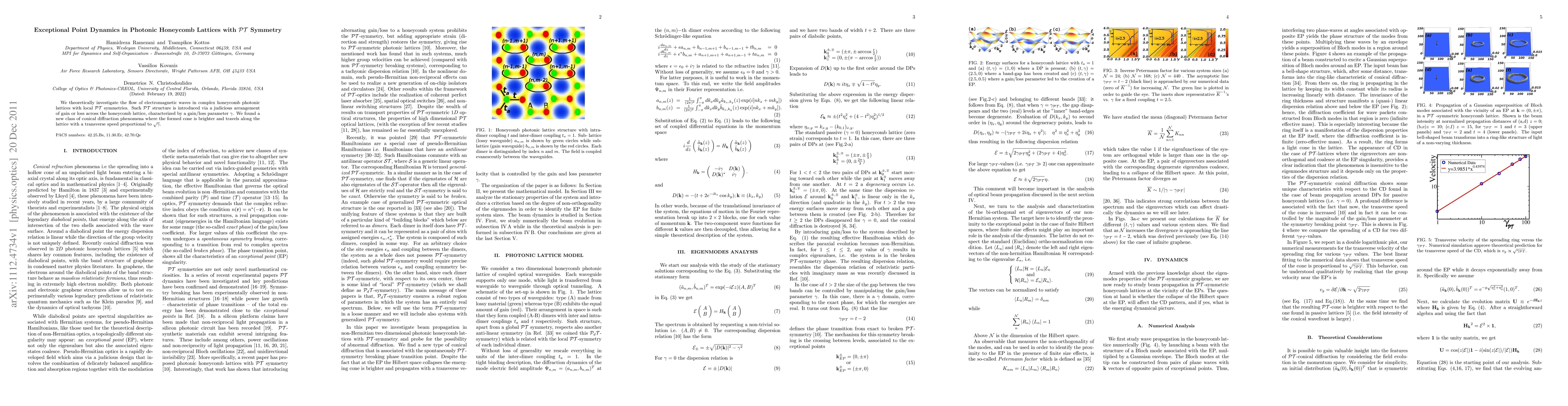 This paper explores electromagnetic wave dynamics in photonic honeycomb lattices with PT symmetry, discovering a novel conical diffraction effect where the cone's brightness and travel speed are directly influenced by the gain/loss parameter γ.
